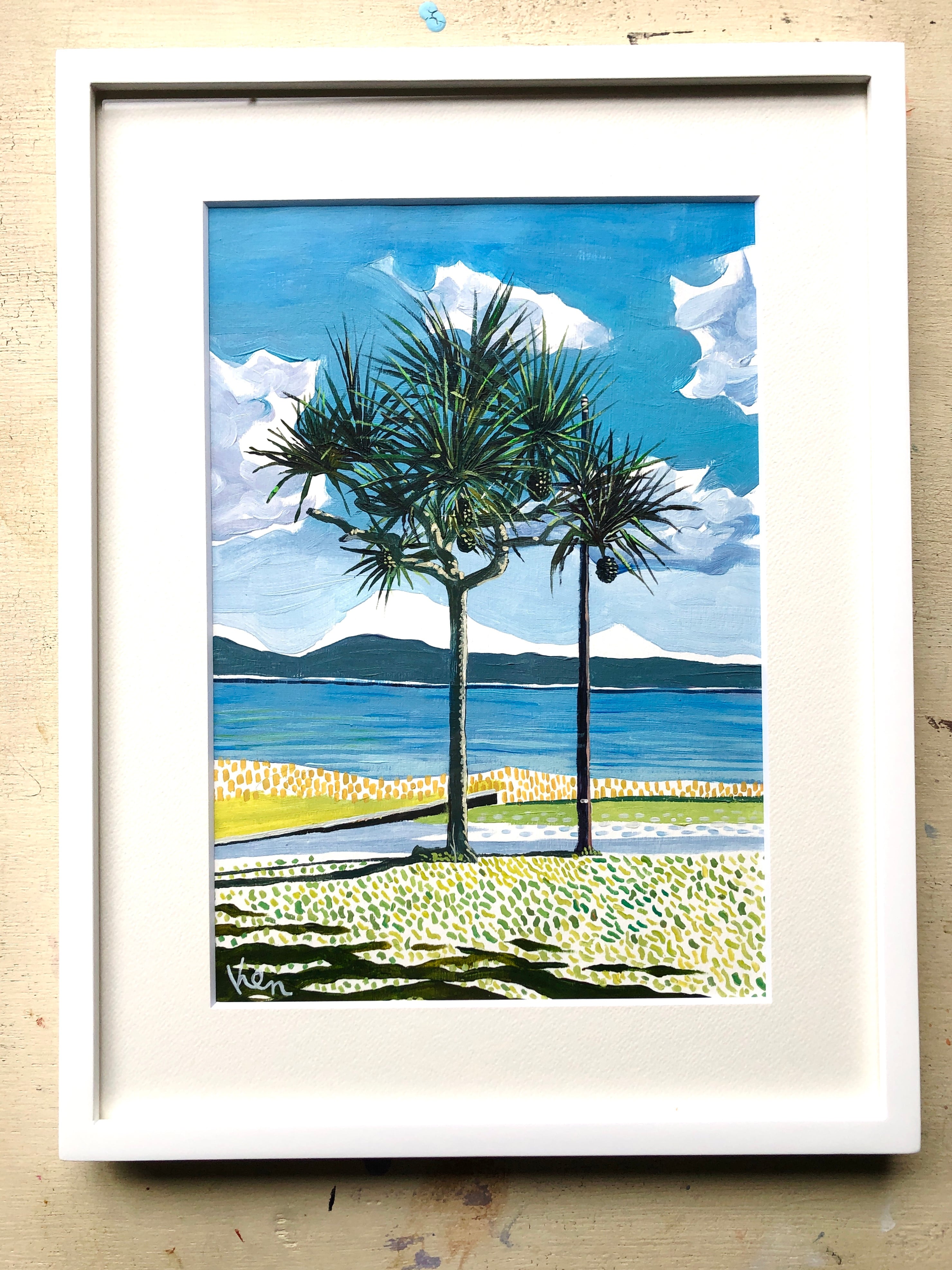 沖縄のヤシの木。シンプルなモチーフなので下の地面の表現を抽象的なパターンの模様にしました。リアルと抽象の混じった遊び心のある作品になりました。いつでも立ち止まって自分を見つめ直すきっかけになる作品です。風と湿度をぜひ感じてほしい。