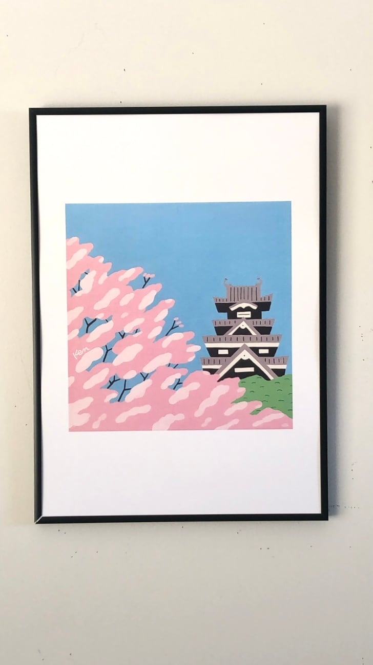 熊本城と桜を描きました!シンプルなアルミフレームで額装。A3サイズで飾りやすい大きさです。