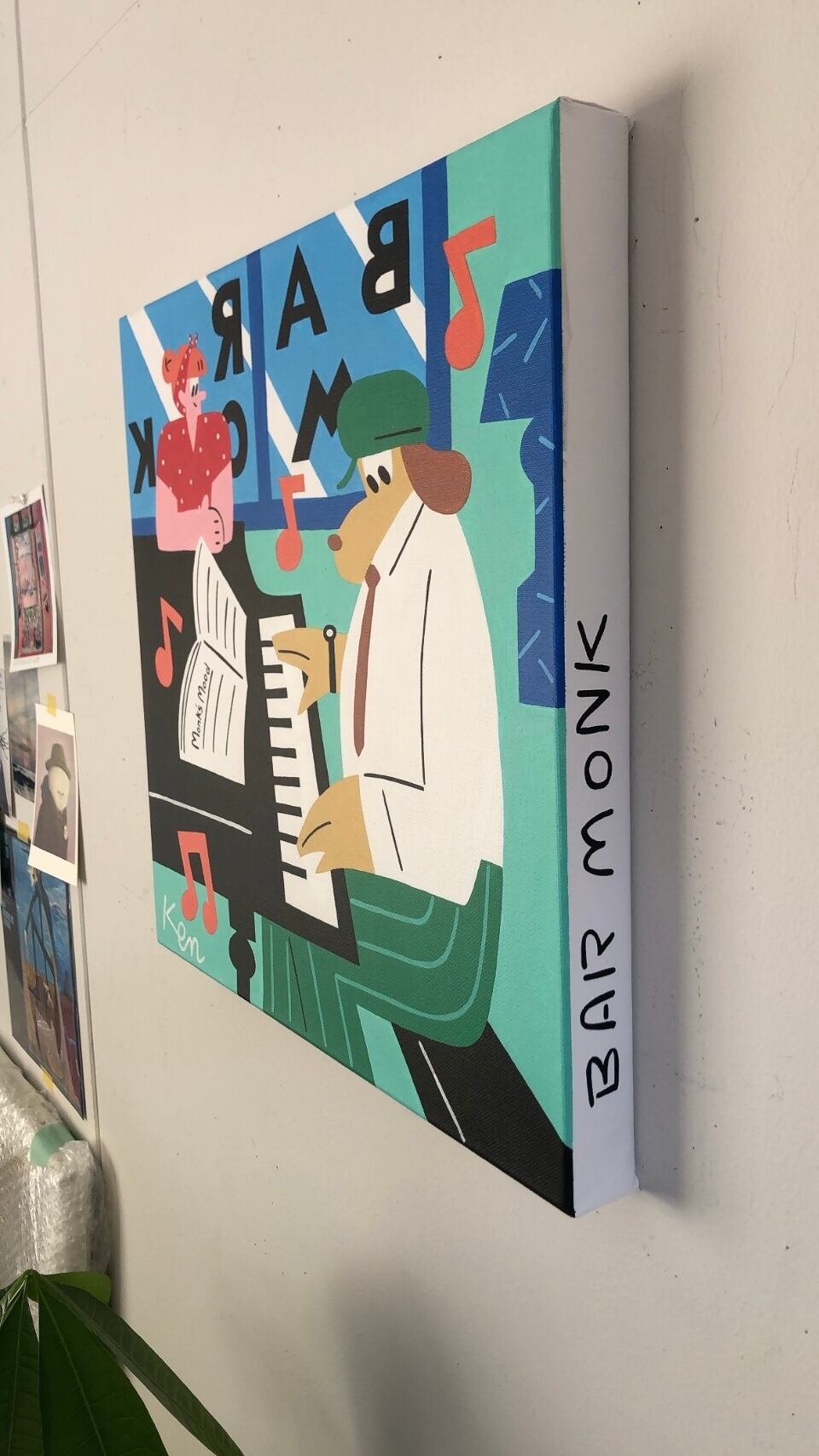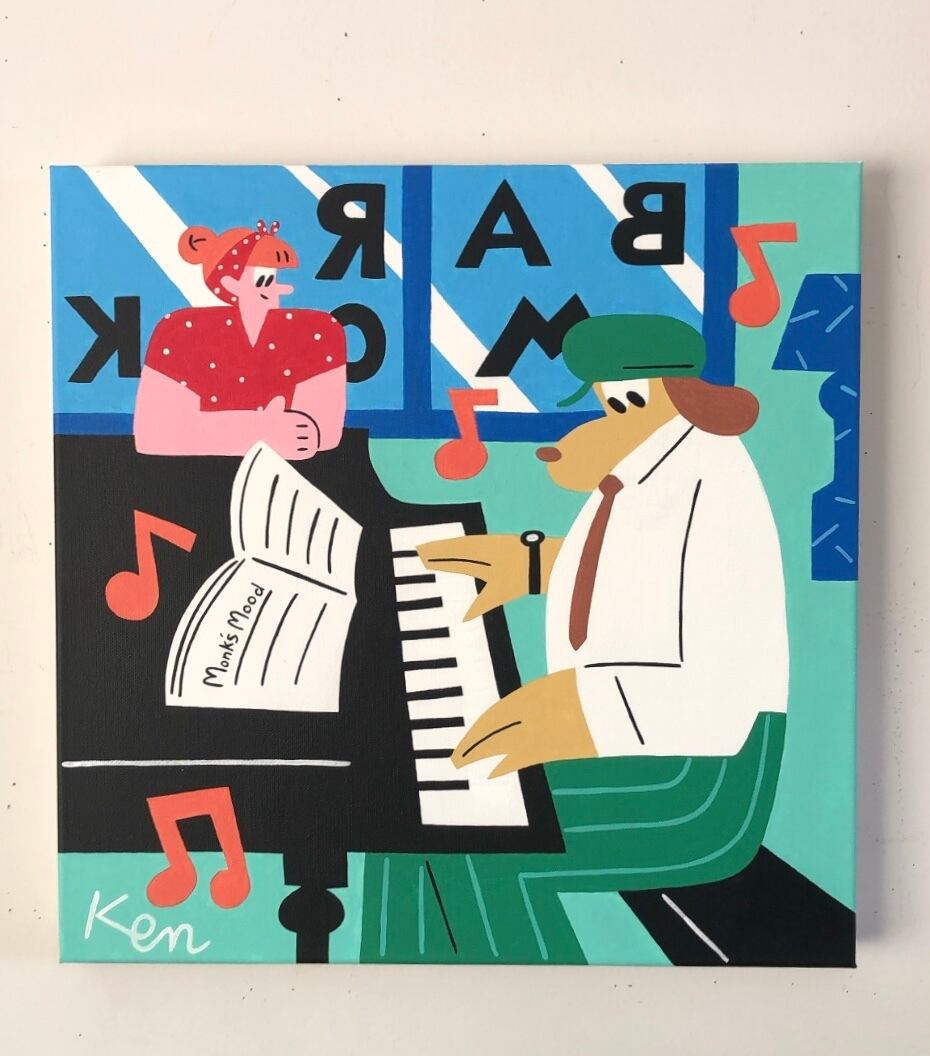 ピアノバーで演奏する犬のジャズピアニスト。厚みのある正方形のキャンバスがpopです。側面には作品のタイトルが描かれています。